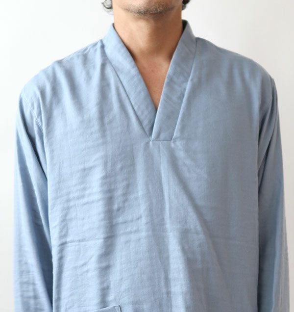 綿に含まれる油分や不純物、糊などを釜でゆっくり煮て洗い「さらし」て乾燥し仕上げるのが江戸時代頃から受け継がれる「和晒製法」です。生地をローラーで挟んで40分程度で一気に処理する洋晒と比べ、全工程で約48時間もかかる和晒製法は生地にストレスをかけないため、生地本来の風合いの良さを引き出し、とことん柔らかいガーゼに仕上がりました。和晒釜をもつ工場は現在日本で十数軒を数える程、大変希少なガーゼを贅沢につかった作務衣の下に来ていただける下着です。下着っぽくないので、1枚でルームウェアとしても、作務衣と重ね着していただいて、はだけてもちらりと見えておしゃれに着こなして頂けます。