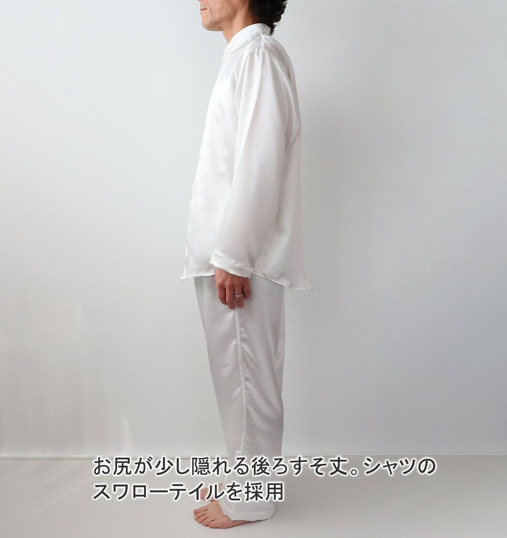 シルクは多孔質のため「夏涼しく、冬温かい」という温度調節の役割をもっています。綿に比べて吸水性、吸湿性が1.5倍でより蒸れを感じにくく、ほどよい保温性がありつつも、温度調整をしてくれるため、夏涼しく、冬温かい、一年中快適なバンドカラーパジャマとなっています。