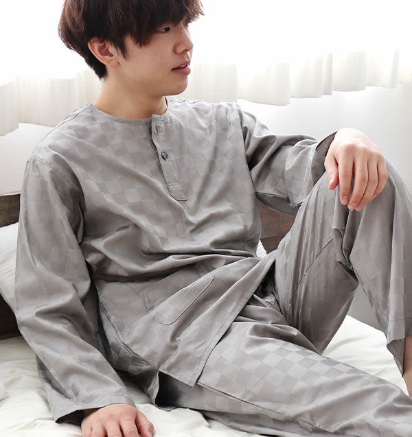 昼夜織サテンの上品な格子柄が織りなす、美しい光沢とコントラストが特徴のブロックチェックサテンヘンリーネックパジャマ。天然の油脂分が多い長綿コーマ糸100%を贅沢に使用しているので、柔らかく滑らかな肌触りに仕上がりました。お部屋にいながら、まるでホテルで過ごしているかのような優雅なひと時をお過ごしいただけます。