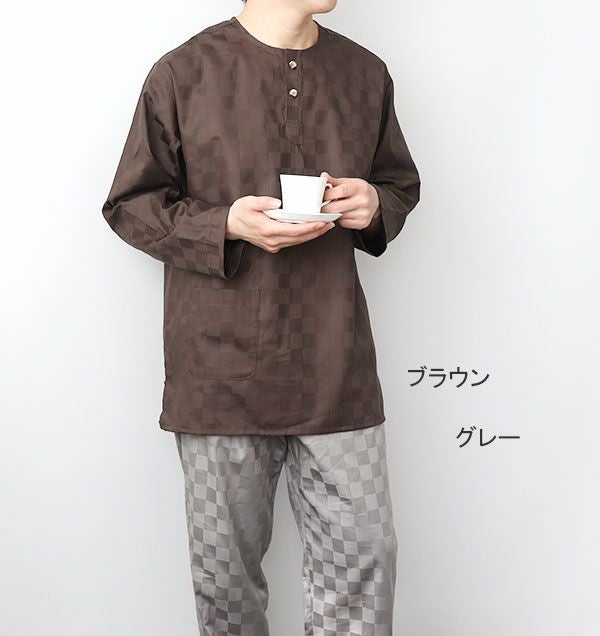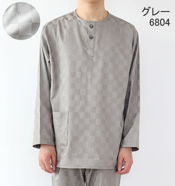 ブロックチェックサテンメンズパジャマ上下セット・長袖/かぶり/ヘンリーネック