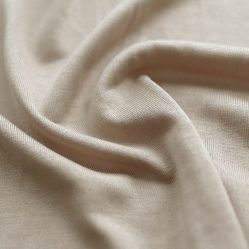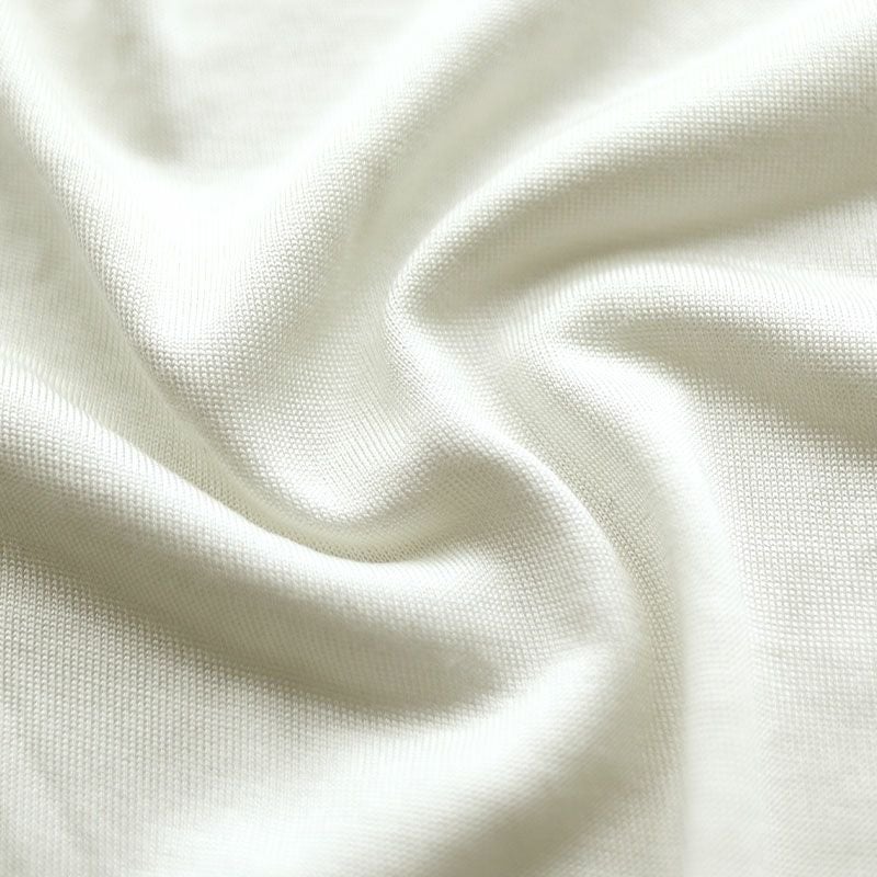 シルクに光沢があるのは、蚕が糸をつくりだす過程でできるフィブロインタンパクという層の三角の断面が作りだすプリズム効果があるからです。このシルクニットは光沢の出やすいサテン織り生地ではありませんが、シルク100%だから天竺ニット編みでも程よい光沢があります。