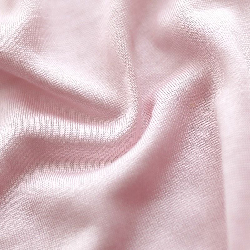 生地は糸が細くなるほど、柔らかく、つるっと滑らかな肌触りになります。こちらのシルクニットはシルク100%の絹紡糸で天竺ニット編みをしているため、すべすべとろとろの肌触りで素肌にやさしく心地よい♪肌沿いも抜群のシルクニットパジャマに仕上がりました。
