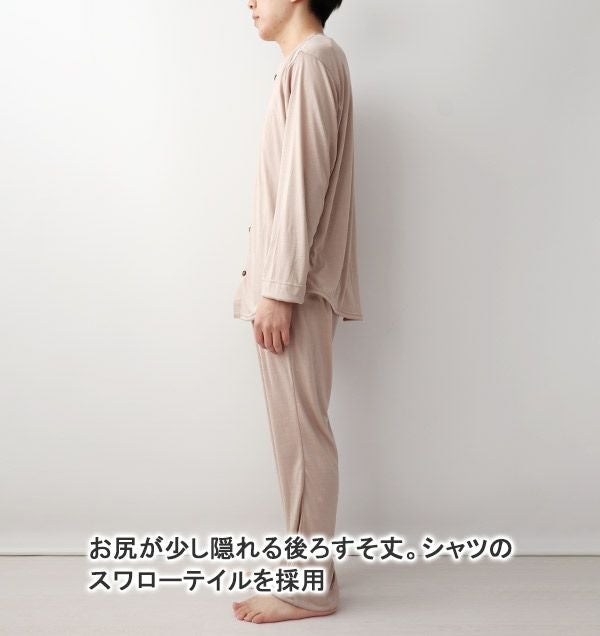 綿に比べて吸水性、吸湿性が1.5倍でより蒸れを感じにくく、ほどよい保温性があります。また「生きた繊維」といわれるシルクは多孔質のため、「夏涼しく、冬温かい」という温度調整をしてくれて一年中快適なシルクニットパジャマです。