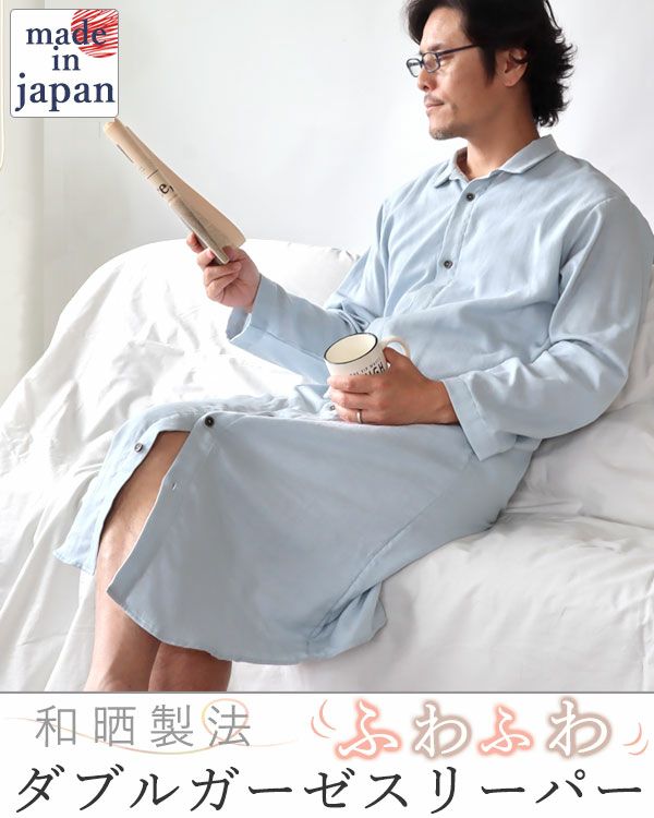 昔ながらの和晒製法で特別ふっくら柔らかなガーゼのスリーパー。メンズXS~5L。ダブルガーゼならではの適度な保温性で春・秋はもちろん一年中、快眠をサポートします。さらに袖丈・着丈の長さを調整できる簡単セミオーダーサービスが可能です。