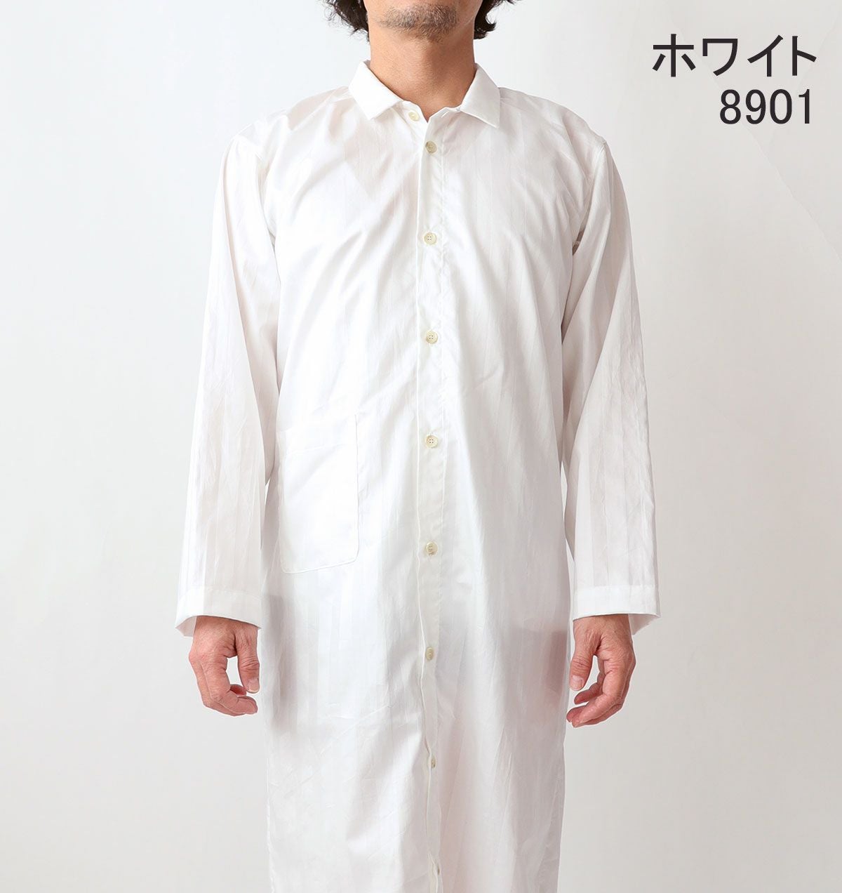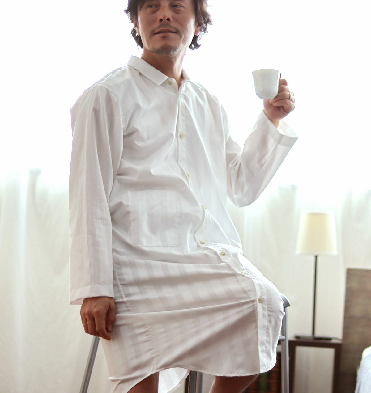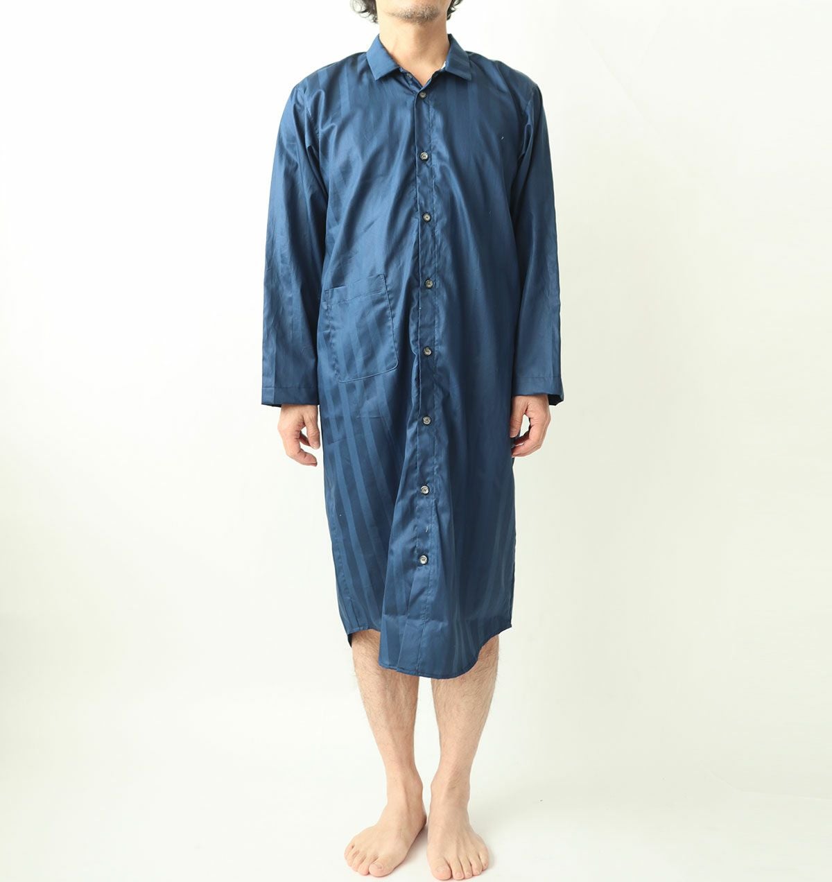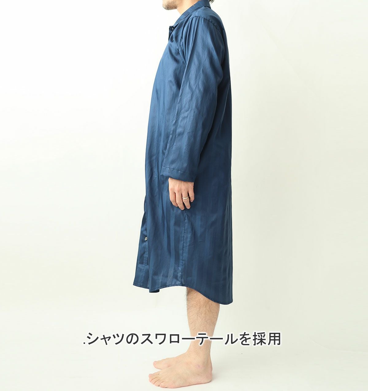 長袖、前開き、襟つきシャツタイプのメンズスリーパーです。高級ホテルで過ごすかのような美しい光沢のサテンストライプ素材。メンズXS~5Lサイズまでご用意。袖丈、着丈の長さを調整できる簡単セミオーダーサービスが可能です。