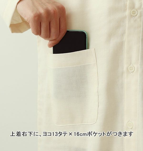 入院パジャマシリーズからふわふわ柔らか和晒ダブルガーゼ素材の登場です。メンズXS~5L。採血・点滴に便利な前開き、心電計や財布なども入る大きなポケット仕様。適度な保温性と抜群の通気性で蒸れずに快適、春秋の最適です。さらに袖丈・ズボン丈を調整可能。