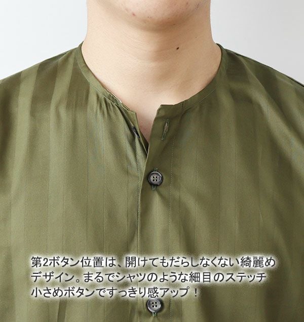おうち時間を贅沢に。高級感のあるシルクサテンにノーカラーメンズパジャマが登場!首周りがすっきりしているので、襟が苦手な方も安心。上品な光沢と、するするとなめらかな肌触りで一日中着ていたくなります。