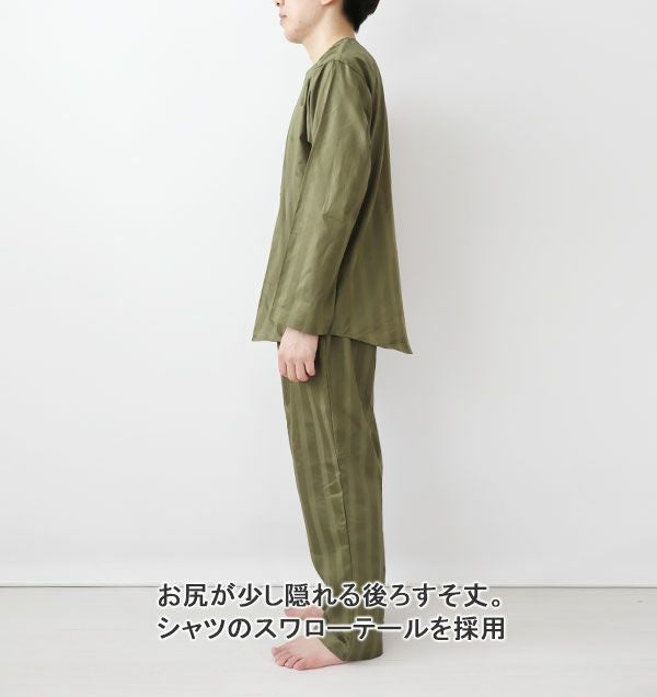 あのホテルのパジャマのよう、高級感あるサテンストライプ サテンストライプメンズパジャマ上下セット・長袖/前開き/襟なし 【オーダーメイド】