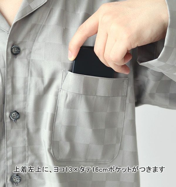 昼夜サテンならではの光沢のコントラストが映えるブロックチェック柄のパジャマシリーズからメンズ開襟デザインの上着単品です!滑らかな肌触りが心地良く、蒸れにくく快適にお使いいただけます。