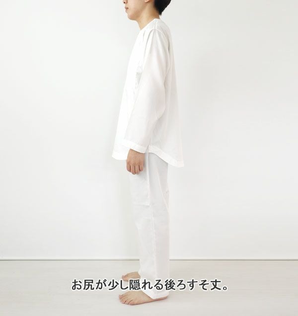 上着の袖口とズボンの裾に約1.5cm幅の平ゴムが入れられます。ゴムを入れるとどうしても上がるので、上がりすぎるのが気になる方は2~3cm長く丈を伸ばしてゴムを入れられるのがおすすめです。