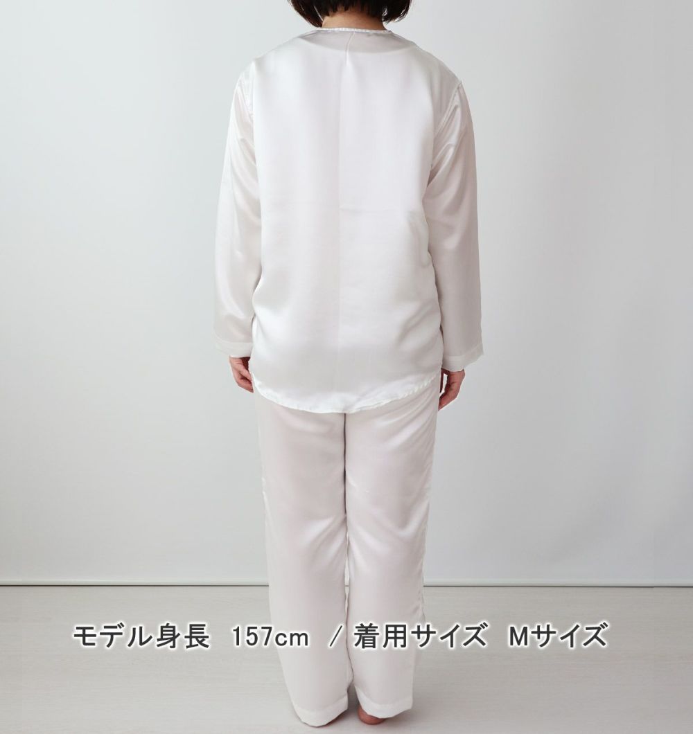 シルクは多孔質のため「夏涼しく、冬温かい」という温度調節の役割をもっています。綿に比べて吸水性、吸湿性が1.5倍でより蒸れを感じにくく、ほどよい保温性がありつつも、温度調整をしてくれるため、夏涼しく、冬温かい、一年中快適なノーカラーパジャマとなっています。