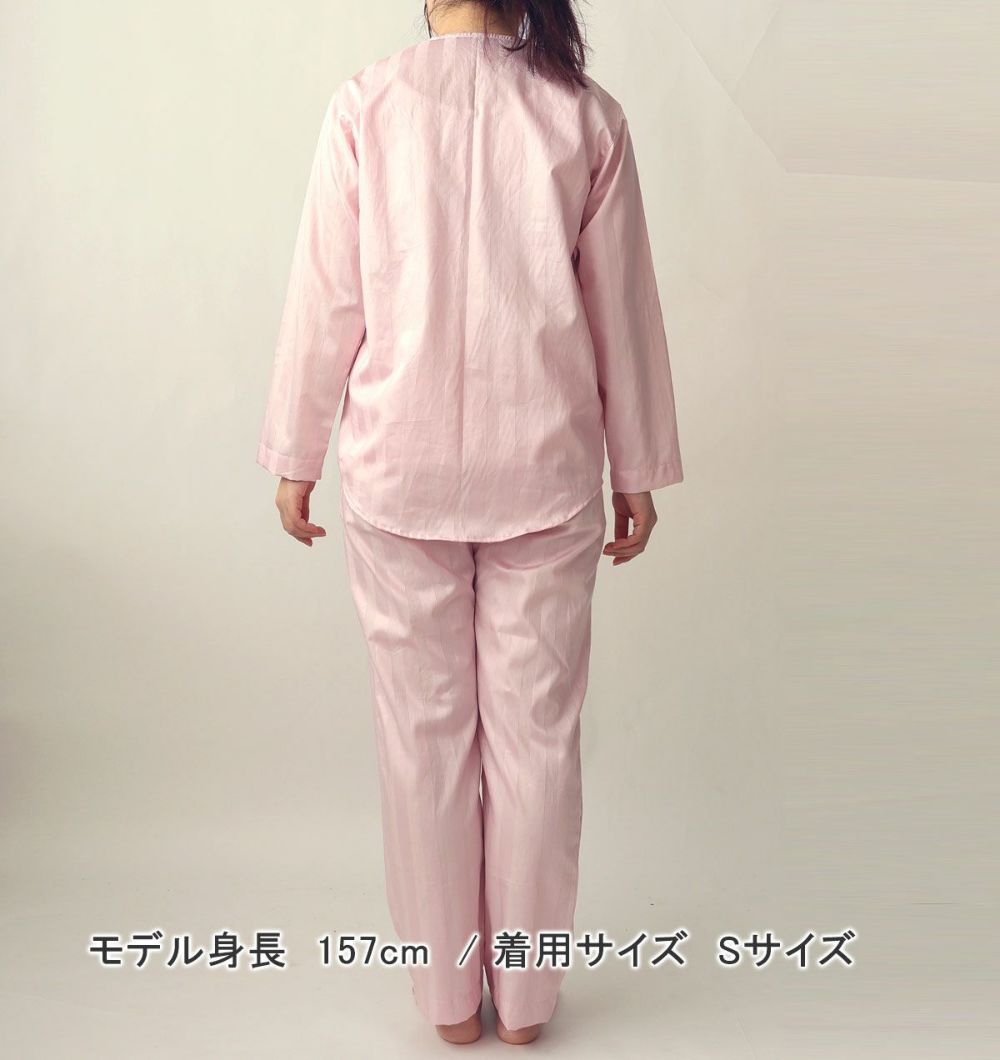 いろんなホテルでも採用されているサテンストライプ。ホテルに滞在しているようなラグジュアリーなひとときを。ズボンだけかえればゴミ出しはもちろん外出にも着ていけそうです!