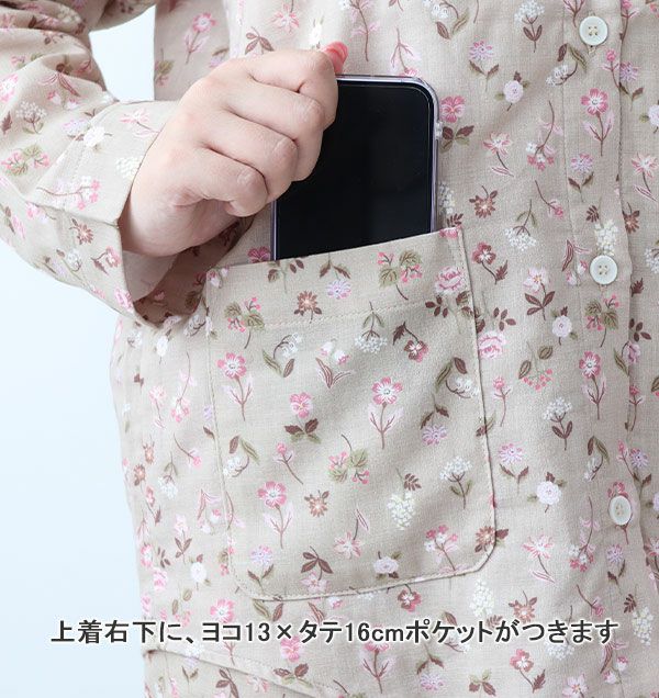 花柄ダブルガーゼ-petit flora-レディースパジャマ上着単品・長袖/前開き/襟あり