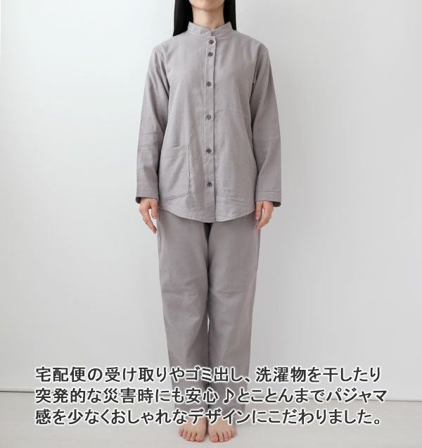 おしゃれなバンドカラーのデザインは ちょっとそこまで、上着を羽織って朝のパンを買いにいったり、ごみを出したり、外出を可能にしました。ボタンをはずしただけで全く違う印象に・・・。ダブルガーゼの生地は着替えたくなくなるふわふわ優しい肌触りに加え、通気性、吸放湿性にも優れておりとっても快適です!