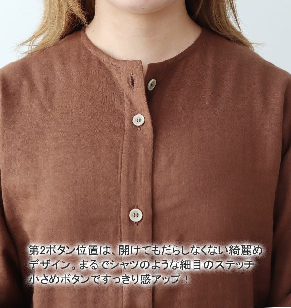 襟が苦手な方に着ていただきたい、前開きの襟なしパジャマです。首元すっきり着脱もしやすくいつでも快適に。まるでシャツのようなデザインで、パジャマはもちろん、部屋着・ルームウェアにもぴったりです。