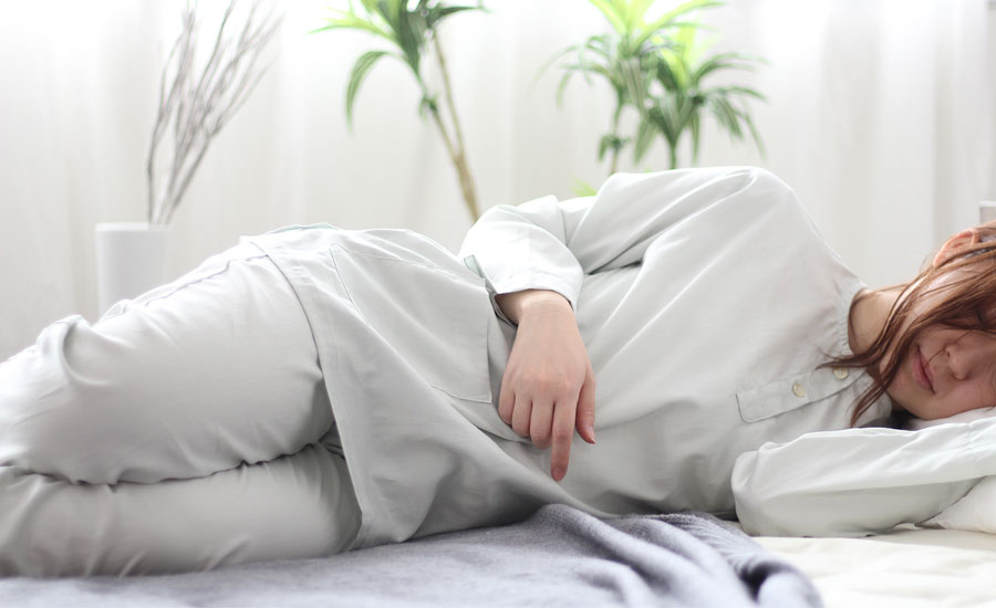 就寝中は締め付け感が少なくお腹にあたる部分もやさしい感触のものがおすすめです。当店で使用しているBBワッフル®ゴムは、ずれにくいのにきつすぎない、パジャマに最適なお腹にやさしいソフトゴムです。
