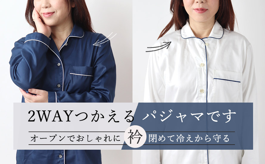 開襟のパイピングのパジャマは大変高級感がありますが、いざお休みになられる時は首があいていて寒いというお声をいただいておりました。お風呂あがりはボタンをはずして、就寝時は第一ボタンをしめて首もとを冷えから守れる、2通り楽しめるおしゃれなデザインです。