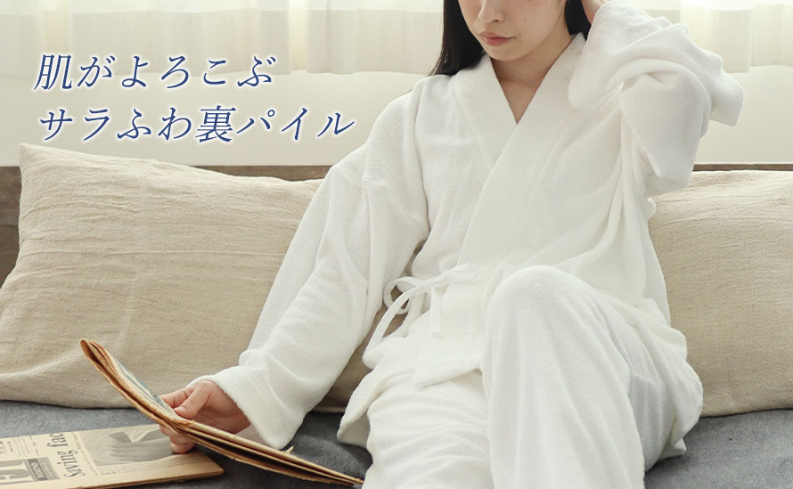 パイル地、タオル地といっても実はたくさんの種類がありますが、パジャマにとって必要なこと、「吸放湿性があること」「寝返りがしやすいこと」「肌触りが良いこと」を追及するとこの両面パイルニットにいきつきました!日本に1社しか持っていない機械で1日に約100mほどしか作れない大変希少なパイルでつくったパジャマ、ルームウェアです。