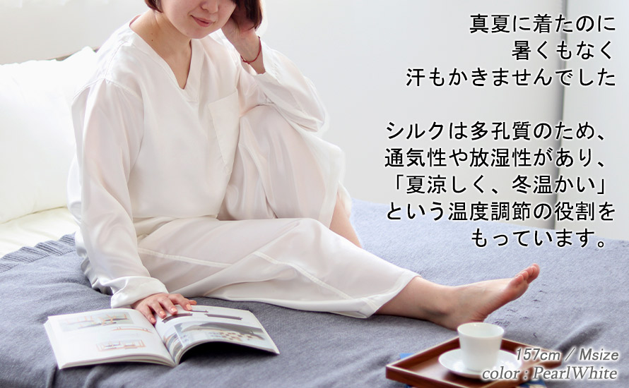 シルクは多孔質のため「夏涼しく、冬温かい」という温度調節の役割をもっています。綿に比べて吸水性、吸湿性が1.5倍でより蒸れを感じにくく、ほどよい保温性がありつつも、温度調整をしてくれるため、夏涼しく、冬温かい、一年中快適なVネックパジャマとなっています。