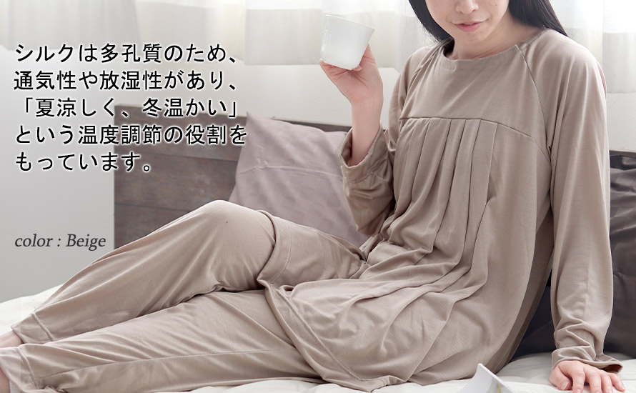 綿に比べて吸水性、吸湿性が1.5倍でより蒸れを感じにくく、ほどよい保温性があります。また「生きた繊維」といわれるシルクは多孔質のため、「夏涼しく、冬温かい」という温度調整をしてくれて一年中快適なシルクニットパジャマです。