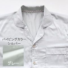 開襟のパイピングのパジャマは大変高級感がありますが、いざお休みになられる時は首があいていて寒いというお声をいただいておりました。お風呂あがりはボタンをはずして、就寝時は第一ボタンをしめて首もとを冷えから守れる、2通り楽しめるおしゃれなデザインです。