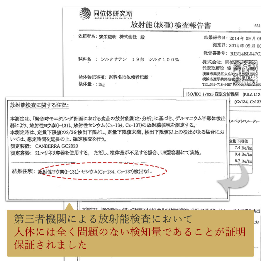 東日本大震災以降、食べ物をはじめ様々な東北地方で作られた物の人体への影響が心配されましたが、こちらのシルクは第三者機関で放射能検査をし、人体には全く問題のない検知量であることが証明、保証されています。