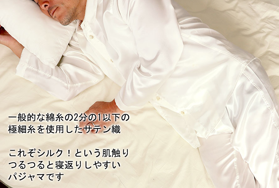 このシルクは19匁で、一般的な綿のパジャマの約30%も軽く、なおかつ耐久性も良いというバランスのよい齋栄織物に特注した国産の川俣シルクサテンの当店オリジナル生地です。