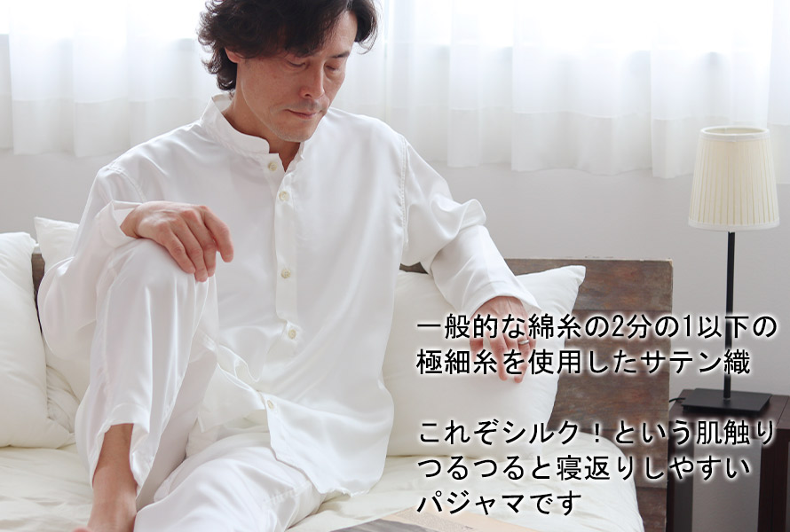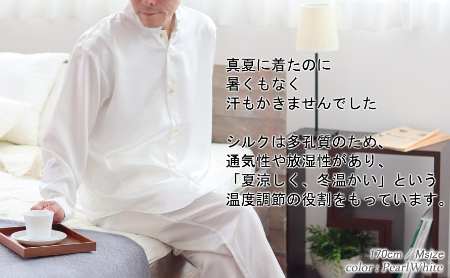 シルクは多孔質のため「夏涼しく、冬温かい」という温度調節の役割をもっています。綿に比べて吸水性、吸湿性が1.5倍でより蒸れを感じにくく、ほどよい保温性がありつつも、温度調整をしてくれるため、夏涼しく、冬温かい、一年中快適なバンドカラーパジャマとなっています。