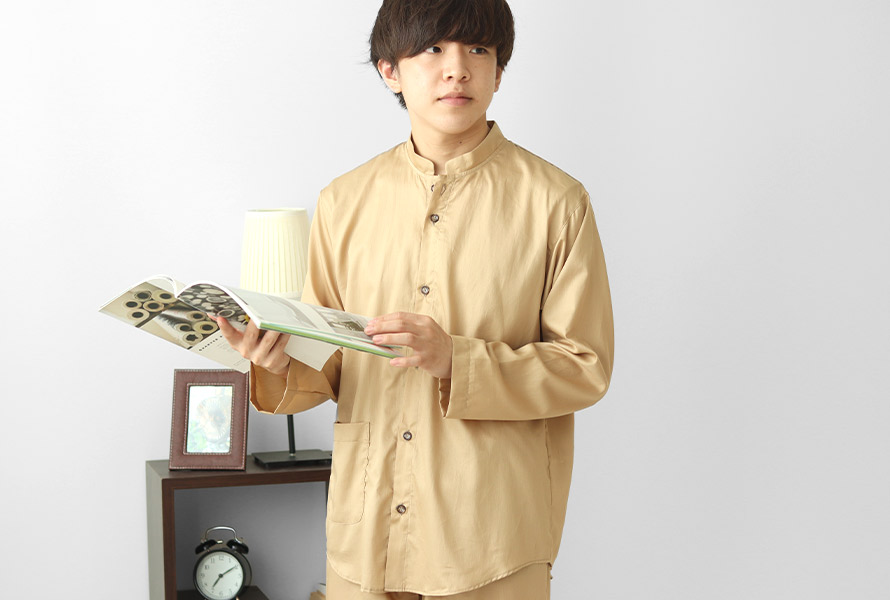 世界3大コットン、スーピマ綿の長繊維を使用したサテン織りの生地は、まるでシルクのような光沢としっとりすいつくような肌触りでするすると寝返りもしやすく、ほどよい温かみもあるので、オールシーズン着て頂けます。おしゃれなバンドカラーも、スーピマ超長綿なら上品な印象に。