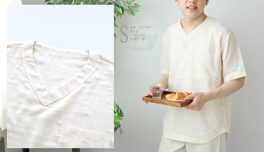 敏感肌用のパジャマはヌボーっとしたイメージになりがち。つくるパジャマではおしゃれなデザインはそのままで縫製を工夫。Tシャツとは違う1枚で大人っぽくおしゃれな印象になれるVネックデザインは部屋着、ルームウェアとしても最適の1枚です。Vネックの首周りはだらしなく見えないようにサイズ感にこだわりました。