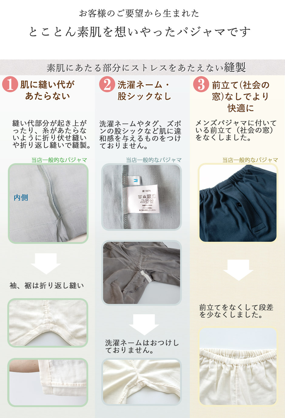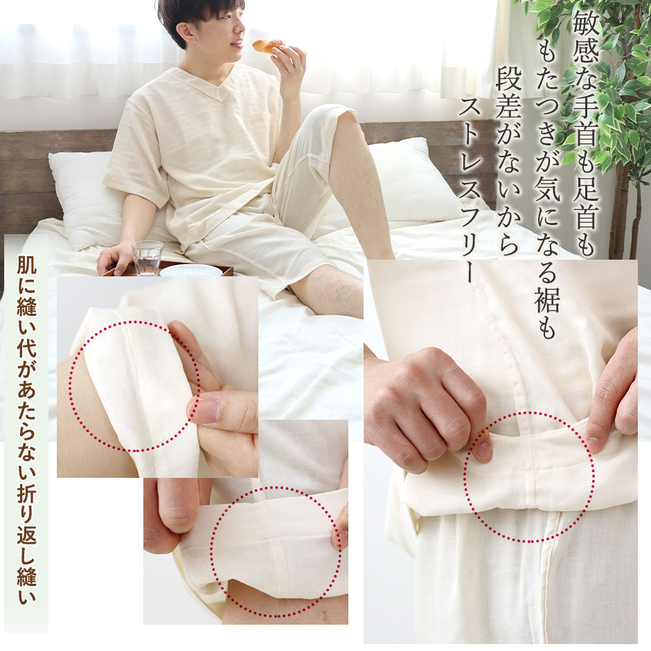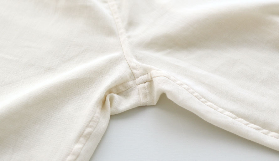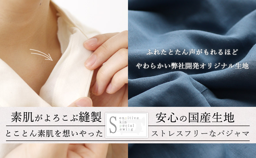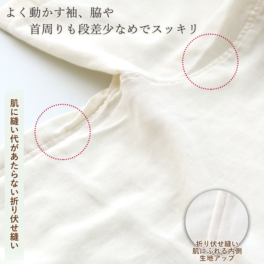 敏感肌や肌のデリケートな方は、洗濯タグや縫い目が肌にふれるとチクチクしたりかゆみがでたりされる方もおられます。異素材を極力つけず、縫い代がお肌に極力あたらない縫製の敏感肌さん用パジャマができました。使い込むほどにお肌に馴染んでいくようなふわふわのオーガニックコットンダブルガーゼで全身を包んでいただきたい、そんな想いをこめ、開発いたしました。