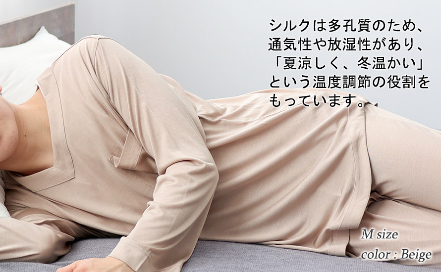 綿に比べて吸水性、吸湿性が1.5倍でより蒸れを感じにくく、ほどよい保温性があります。また「生きた繊維」といわれるシルクは多孔質のため、「夏涼しく、冬温かい」という温度調整をしてくれて一年中快適なシルクニットパジャマです。