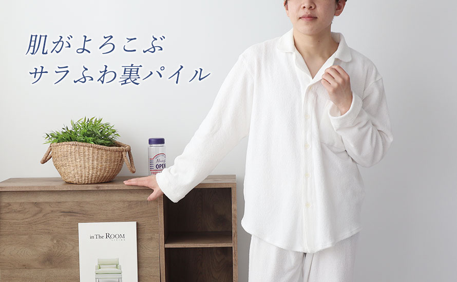 パイル地、タオル地といっても実はたくさんの種類がありますが、パジャマにとって必要なこと、「吸放湿性があること」「寝返りがしやすいこと」「肌触りが良いこと」を追及するとこの両面パイルニットにいきつきました!日本に1社しか持っていない機械で1日に約100mほどしか作れない大変希少なパイルでつくったパジャマ、ルームウェアです。