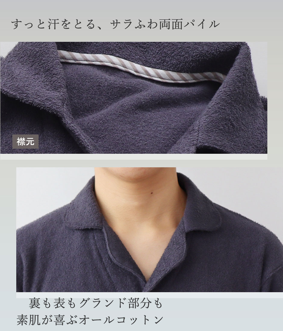 両面パイルだから汗ばむ季節も安心♪ 綿パイルが肌に直接あたるので、まるでタオルのように汗もよく吸ってくれて気持ちいい!伸縮性のある編み物のニットパイルの場合、おもて面がパイルでも肌に当たる方はツルっとしたものがほとんど。パジャマだからこそ肌にあたる裏面が大切です。タオルのようにふわふわしたパイル地ではなく、短めのミニパイルなので、柔らかいけどサラサラした肌触りでべたつきません。