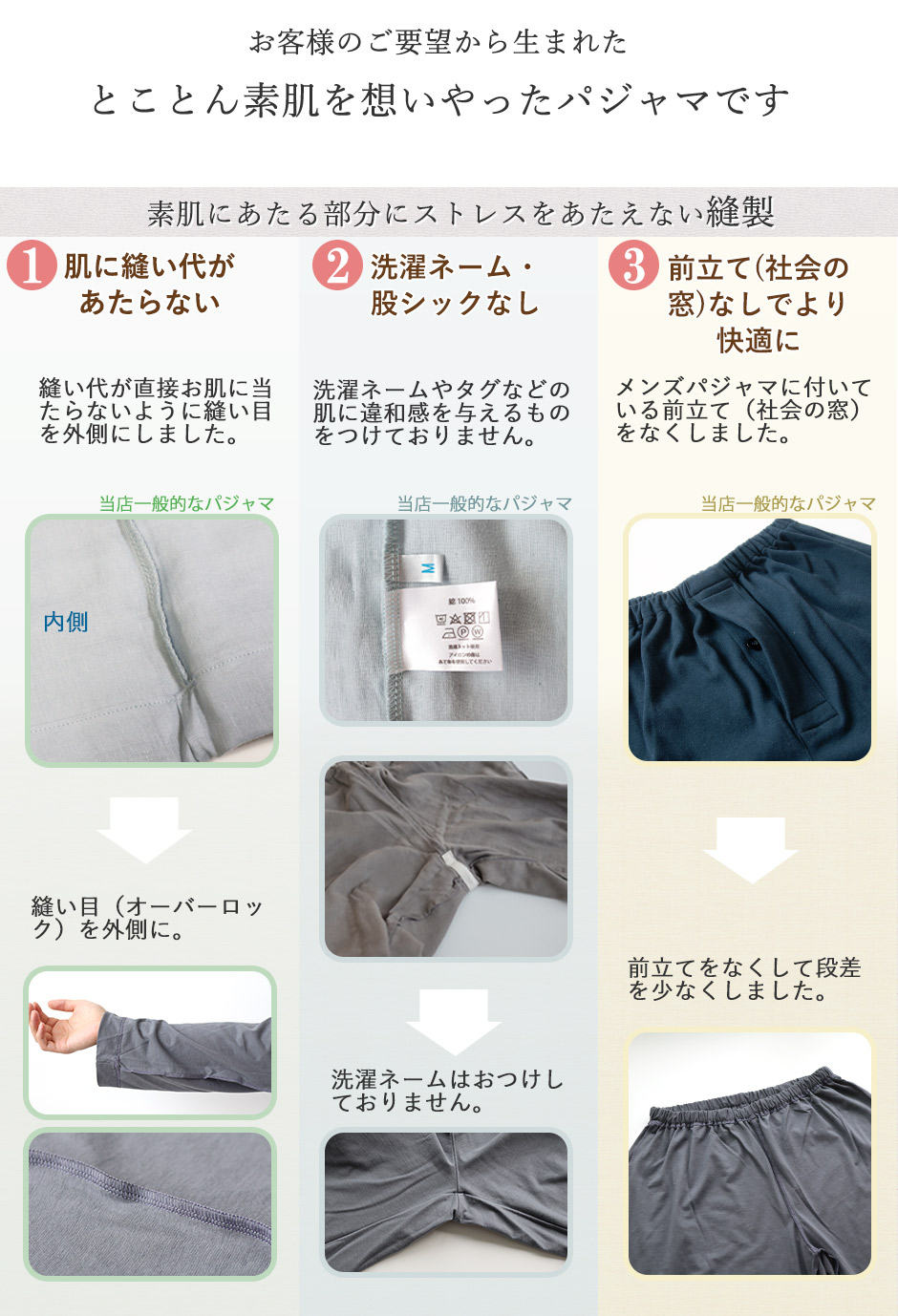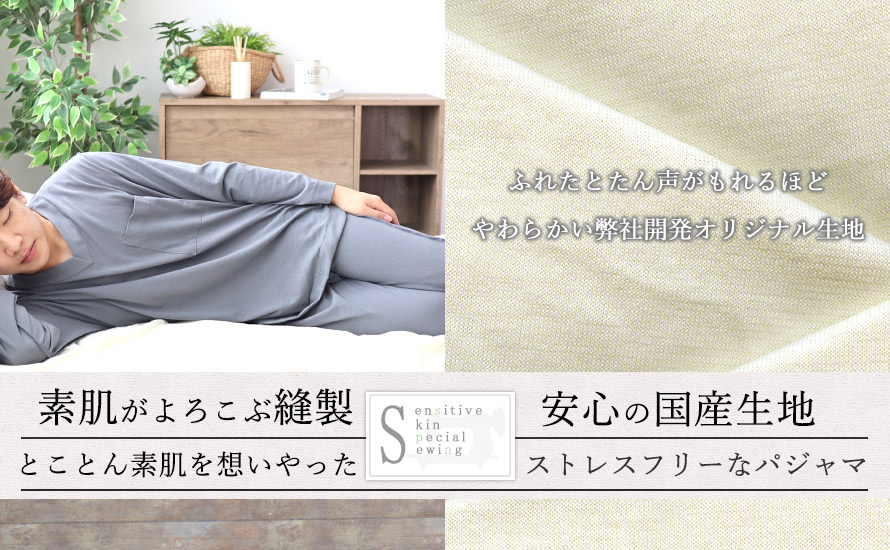 敏感肌や肌のデリケートな方は、洗濯タグや縫い目が肌にふれるとチクチクしたりかゆみがでたりされる方もおられます。異素材を極力つけず、縫い代や縫い目が肌に極力あたらない敏感肌の方の為のパジャマができました。ほどよい伸縮性と頬ずりしたくなるような柔らかさが特徴の天竺ニットで全身包んでいただきたい、そんな想いをこめ、開発いたしました。