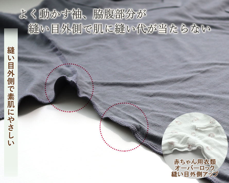 腕、脇、袖周り等、お肌のデリケートな赤ちゃんの衣類と同じようにオーバーロックの縫い目を外側にすることで縫い代がお肌にあたらないようにしました。