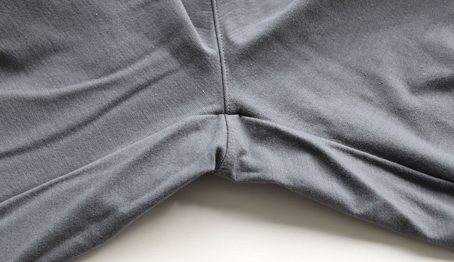 糸が細いほど生地は柔らかくなります。天竺ニットは太い15番手糸から細くても30番手糸が多いですが、かなり細い40番手糸を使用することで、ふんわり滑らかなほおずりしたくなるような柔らかさです。その柔らかさゆえに裁断、縫製泣かせといわれるほど。高級ブランドのTシャツにも使われる生地を贅沢にもパジャマにしました。