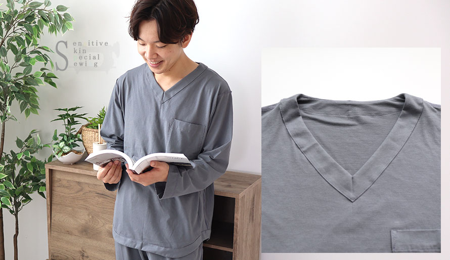 やわらか天竺ニットメンズ敏感肌パジャマ上着単品・長袖/かぶり/Vネック