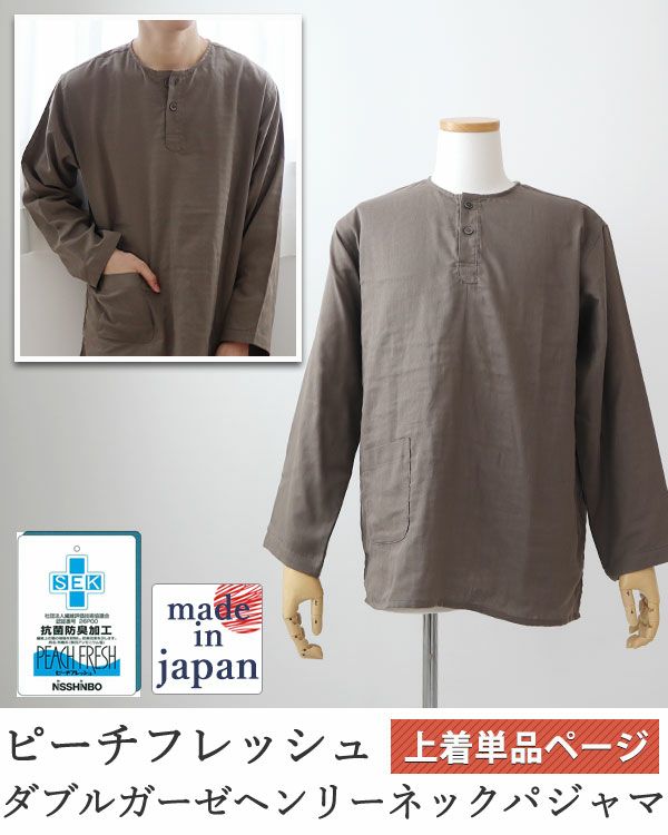 SEK取得の日清紡ピーチフレッシュ加工で清潔 抗菌防臭ダブルガーゼメンズパジャマ上着単品・長袖/かぶり/ヘンリーネック 【オーダーメイド】