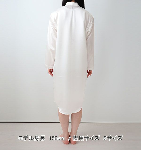 美しい光沢と滑らかな肌触りが人気のシルクサテンからレディースワンピースの登場です。ぱっと羽織れるシャツタイプ、素材の特性上、非常に軽く体への負担もありません。安心安全の日本製で贈答用にもおすすめです。