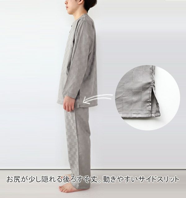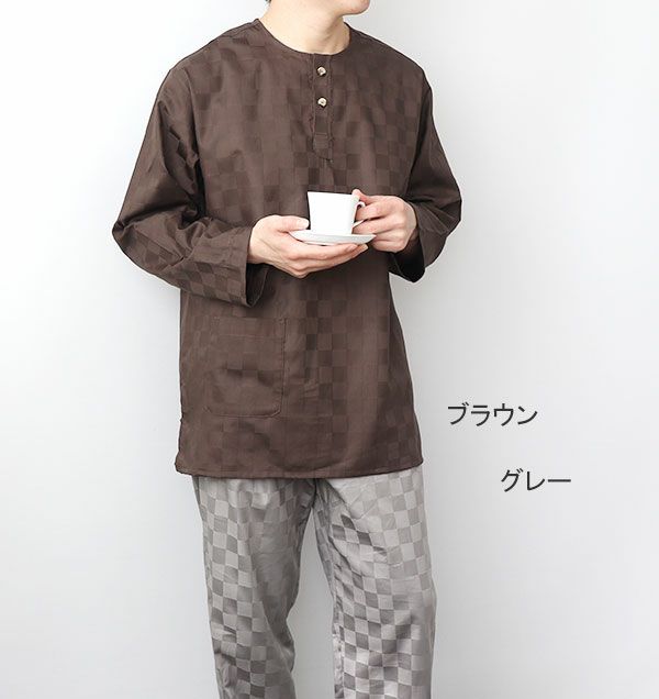 おしゃれで高級感のあるブロックチェック柄のメンズヘンリーネックパジャマの登場です!昼夜サテンならではの美しい光沢のコントラストでラグジュアリーな気分に浸れる一枚!滑らかな肌触りの心地良い綿素材です。