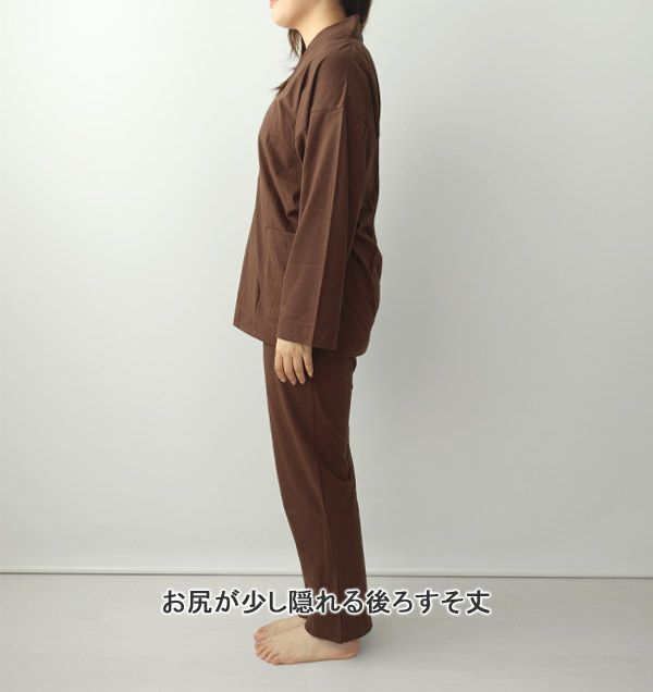 一般的な作務衣は7分丈のものが多いのですが、つくるパジャマの作務衣は上着は手首まで、ズボンも足首まである10分丈。オプションで作業がしやすいゴムも入れられます。