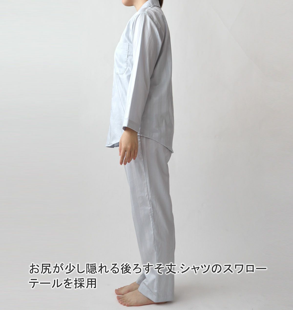 まるでシャツのようなデザインのスモールカラーデザイン。細目ステッチや小さめボタン等を採用することで、パジャマ感を抑えてすっきり感アップ!