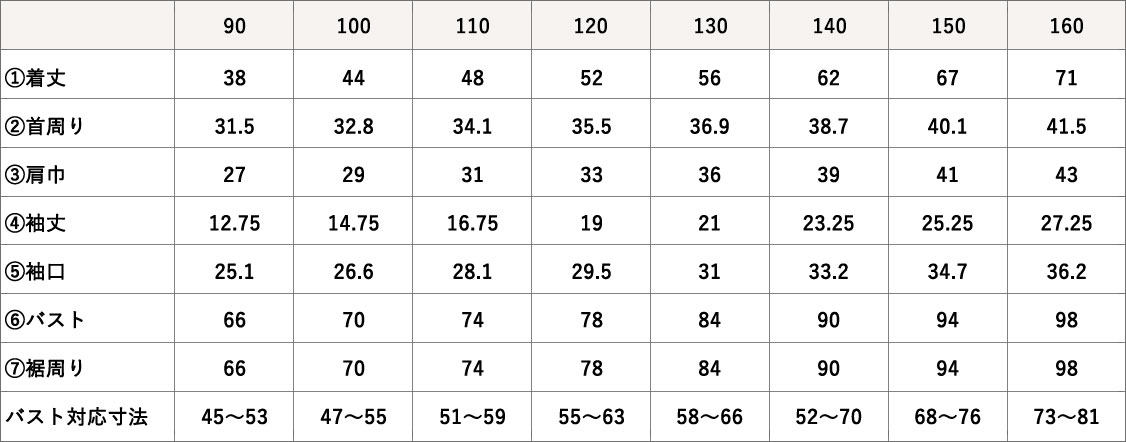- ① バストが90cmの場合、基本サイズはバスト対応寸法からMサイズを選ぶ