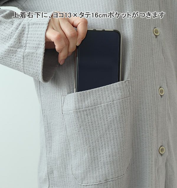 細目ステッチや小さめボタン等を採用することで、パジャマ感を抑えてシャツのような上品な見た目に。ズボンだけかえればゴミ出しはもちろん外出にも着ていけそうです!ニットサッカー生地表面の凹凸がお肌との接地面積を少なくしてくれ、汗をかいても張りつきにくく夏のおしゃれなルームウェアとしてもおすすめです!
