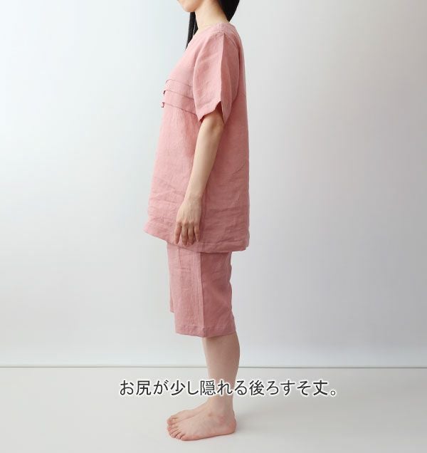 一般的な生地は色をぶれさせないため、漂白済みの「晒(さらし)」の生地を染めて、ムラのない均一な色を出します。一方こちらのリネンパジャマは、漂白前の生成(きなり)の上から染めることで、自然の草木染めのようなゆらぎのある、穏やかで深い色に仕上げています。