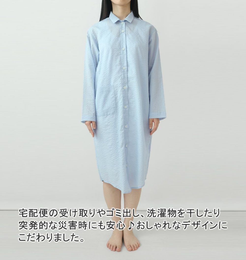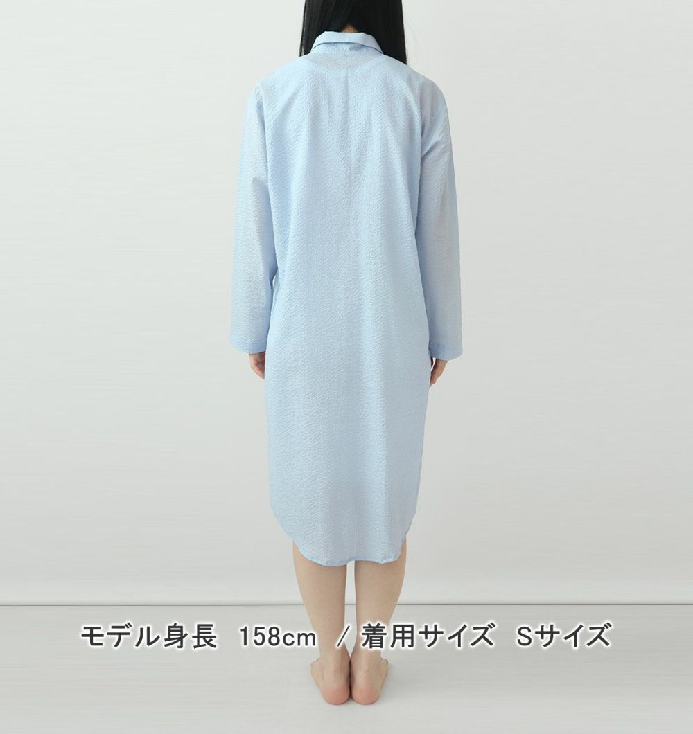 ふんわりとやわらかく、ごわごわしないエアリーリップル。シャツワンピースで、おうち時間にゆったりくつろぎを。肌寒いときは、羽織りやガウンとしてもお使いいただけます。ルームウェアにも最適!
