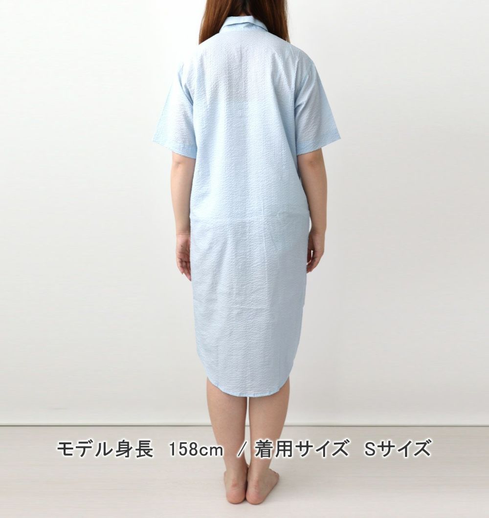 ふんわりとやわらかく、ごわごわしないエアリーリップル。シャツワンピースで、おうち時間にゆったりくつろぎを。肌寒いときは、羽織りやガウンとしてもお使いいただけます。ルームウェアにも最適!