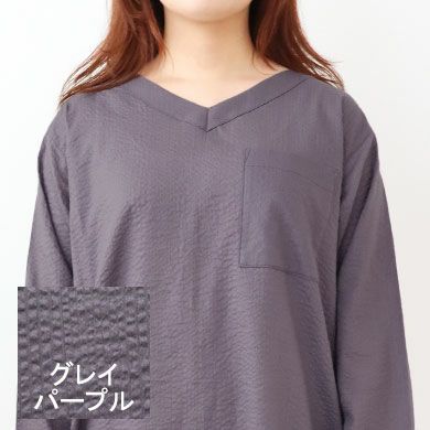 ふんわりとやわらかく、ごわごわしないエアリーリップル。Vネックデザインのかぶりワンピースでおうち時間にゆったりくつろぎを。ルームウェアにも最適!