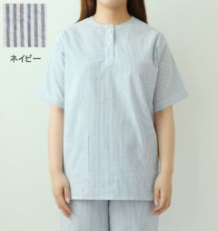 一枚でさまになる、おしゃれなヘンリーネックデザイン。かぶりタイプのヘンリーネックは着脱しやすいのもポイント。夏にぴったりなサッカーストライプは、ぽこぽこした生地で汗をかいてもはりつかず、いつでもさらっと快適!パジャマとしてはもちろん、部屋着・ルームウェアにもぴったりです。